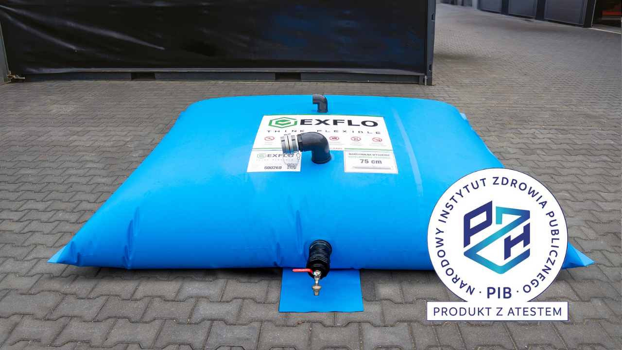 Zbiorniki elastyczne do magazynowania wody pitnej – służą do magazynowania wody pitnej zarówno wewnątrz, jak i na zewnątrz budynków. Ich mobilna konstrukcja umożliwia łatwe przenoszenie i instalację wszędzie tam, gdzie potrzebne jest tymczasowe lub stałe źródło wody pitnej. Wymagają jedynie równego, stabilnego podłoża – może być to beton, kostka brukowa lub wyrównane podłoże gruntowe. Zbiorniki posiadają niezbędne atesty do kontaktu z wodą pitną, co gwarantuje bezpieczne przechowywanie wody przeznaczonej do spożycia.